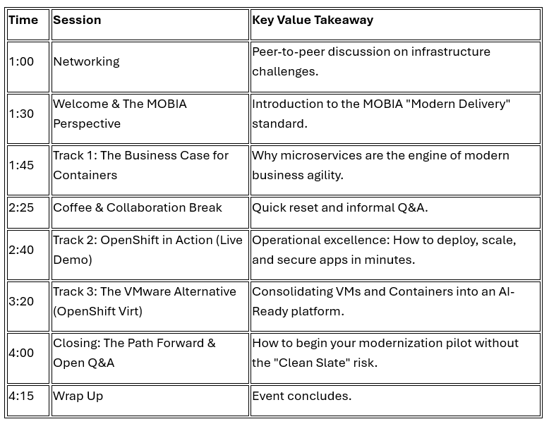 From manual server builds to automated, AI-ready platforms. Join MOBIA and Red Hat to learn how to bridge the gap between legacy virtualization and modern business velocity.